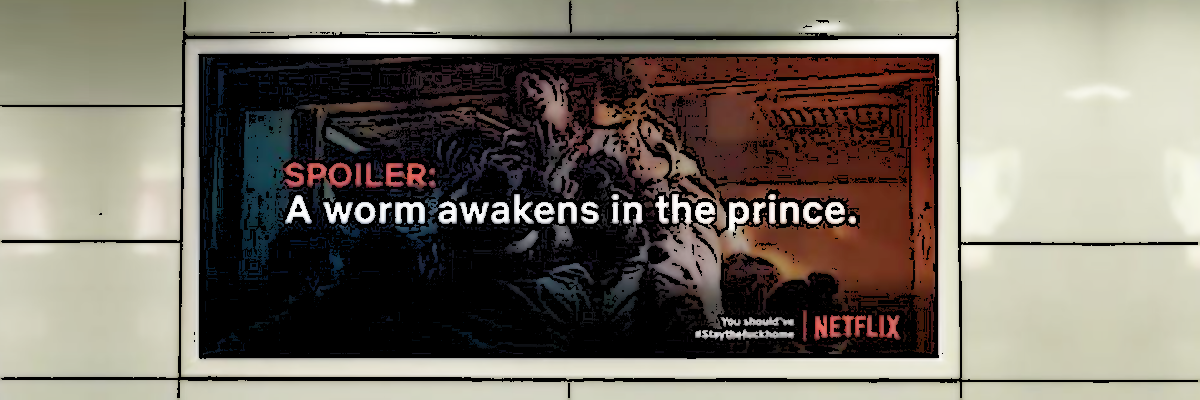 Om mensen te motiveren om thuis te blijven werd deze briljante billboard campagne bedacht; als je tĂłch naar buiten zou gaan, zou je het risico lopen om spoilers tegen te komen over de afloop van populaire Netflix series. De campagne werd bedacht door twee studenten uit Duitsland. Helaas inmiddels afgewezen door Netflix, maar de campagne ging toch, eh, viraal.