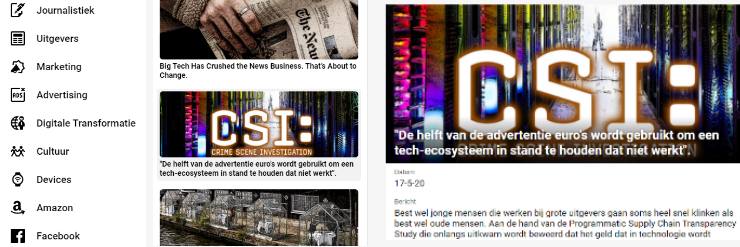 Online uitgevers ontslaan steeds meer mensen. Door Corona gaat al 50% van de advertentie inkomsten verloren, maar er is nog meer aan de hand. Content van uitgevers wordt klakkeloos gekopieerd en geplaatst op fake websites die met de gestolen content advertentie inkomsten binnen halen. In dit artikel laat CNBC journaliste Meg zien hoe simpel dat is: Ze bracht in een paar dagen met gestolen content zelf een fake site online, waar vervolgens al snel hele keurige adverteerders op verschenen. Lesson learned: Marketeers, wéét waar je advertenties terecht komen. Uitgevers; controleer of anderen er met je inkomsten vandoor gaan door je content te plagiëren. LINK.