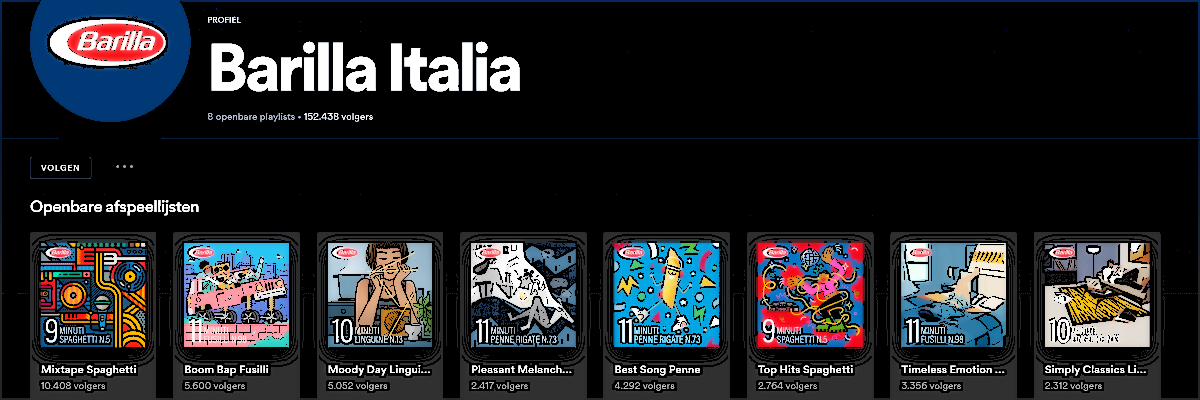Perfect getimed, met verschillende nummers die per pasta variant samen de exacte kooktijd vormen. Er is een aparte Playlist voor elke soort pasta en de muziek is zeker niet de standaard “O Sole Mio” soundtrack uit het doorsnee pizza restaurant, maar behoorlijk hip, internationaal en verrassend. Prima marketing. LINK.