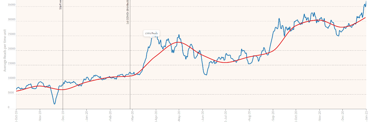 In dit artikel beschrijft de redactie wat ze de afgelopen jaren heeft gedaan en welke culturele verandering er voor nodig was om de bovenstaande grafiek te realiseren; het aantal “Premium” nieuwsartikelen dat wordt gelezen op de sites. Het is een verhaal over verandering, kwaliteit, cultuur, werkwijze en visie. Erg interessant en een hele mooie prestatie. LINK.