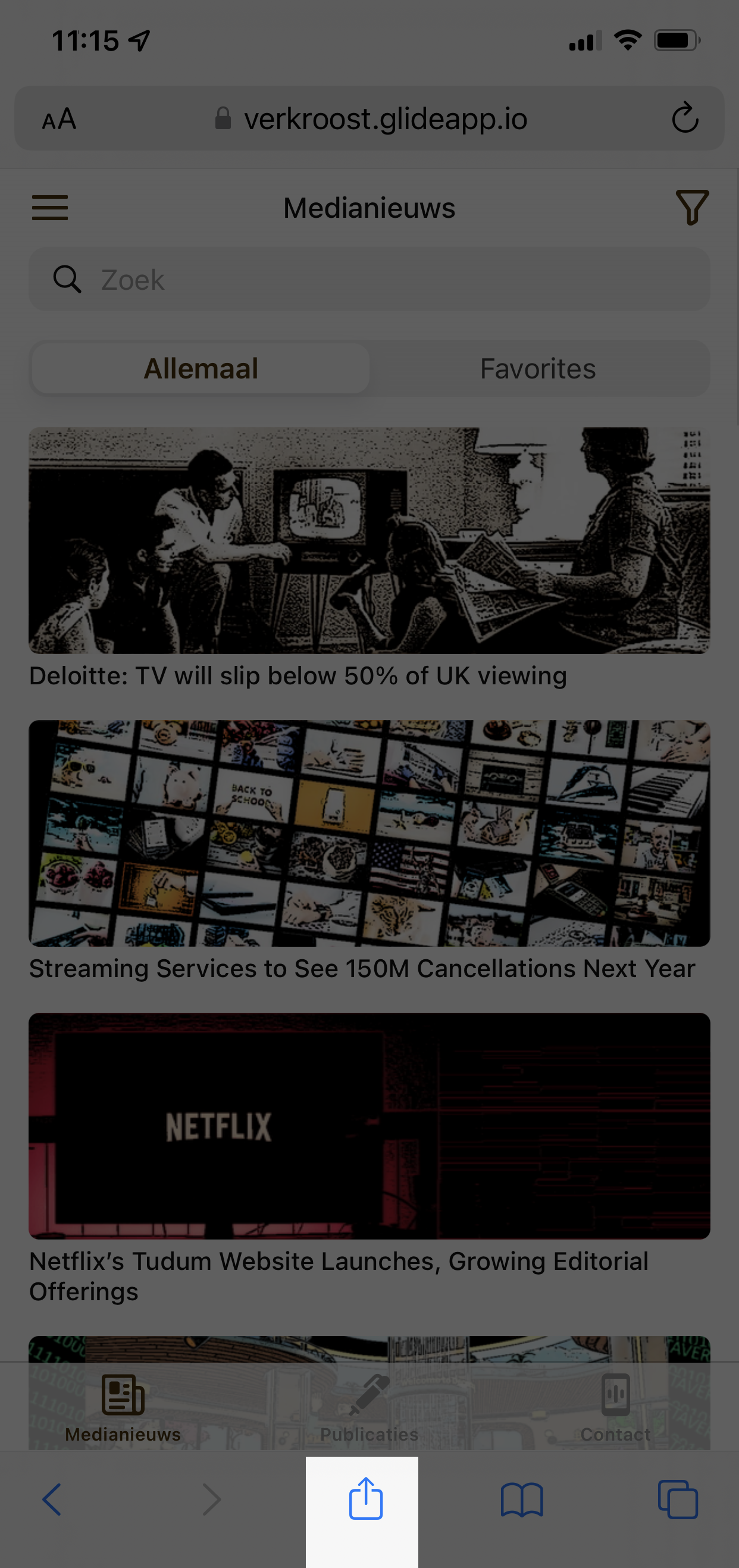 Voor de iPhone zie je hieronder hoe je dat doet; Ga naar https://verkroost.glideapp.io en klik op het icoon onderaan je scherm: