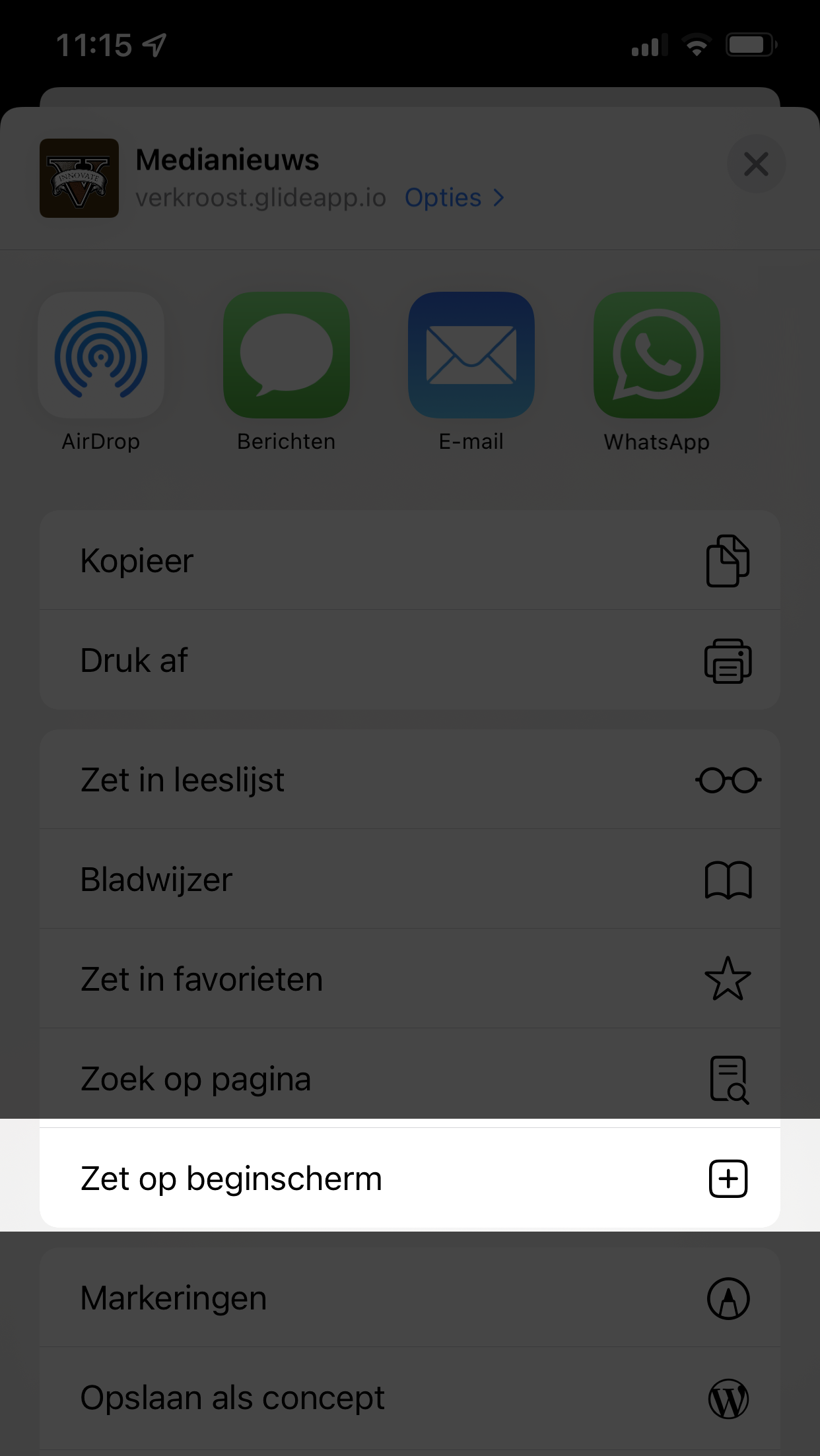 Scroll in het menu iets naar beneden en kies “Zet op beginscherm”.