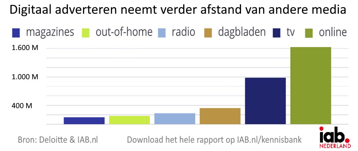 Dutch digital advertising spendings have increased tenfold over the last 10 years, overtaking all traditional media types. Impressive to see Digital advertising extend its lead even further in 2016 with another year over year growth of 8,3% – on an already massive total.